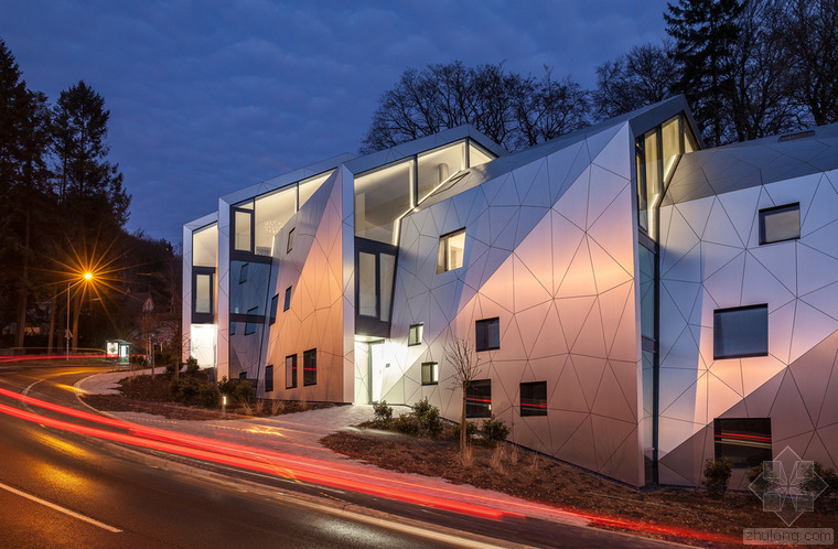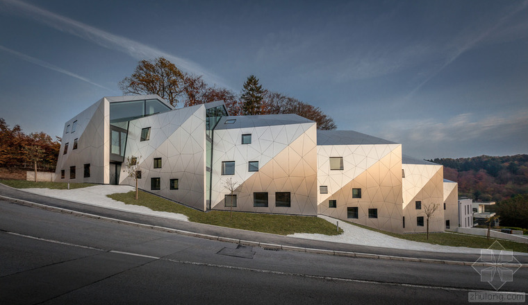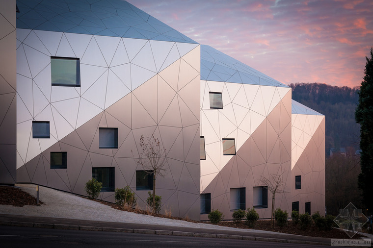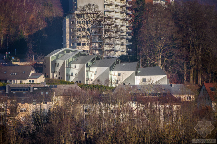 根據(jù)城市建筑規(guī)章條例規(guī)范,無論地形有多奇怪,都可以建造簡易的兩層單體建筑,并且?guī)в械叵率?。但是,周圍的環(huán)境、特殊的地形條件和基地的形式造就了各種各樣的建筑,與此同時也產(chǎn)生了上文所指出的問題?;匚挥谝粭l十分彎曲的街道邊緣;地形高差達10米,非常陡峭;基地上保留有樹齡300年的古樹,且被列為國家歷史文物。所有的這些狀況使建筑有了最初的形狀。此外,該建筑還呼應(yīng)了特殊的城市環(huán)境(一邊是小體量的住宅單元,而另一邊是大體量的公寓樓。)建筑師通過將主體分成六個小的、垂直位移的體塊,創(chuàng)造了一個巧妙地轉(zhuǎn)變。建筑通過這種方法適應(yīng)了環(huán)境,既保持了所需的密度,又賦予其歸屬感、特性和人性化。體塊的分割和位移需要謹慎地研究自然采光的需求、朝向城市景觀的開闊視野,并且創(chuàng)造天地之間的視覺連接,同時還要保護住戶的隱私。