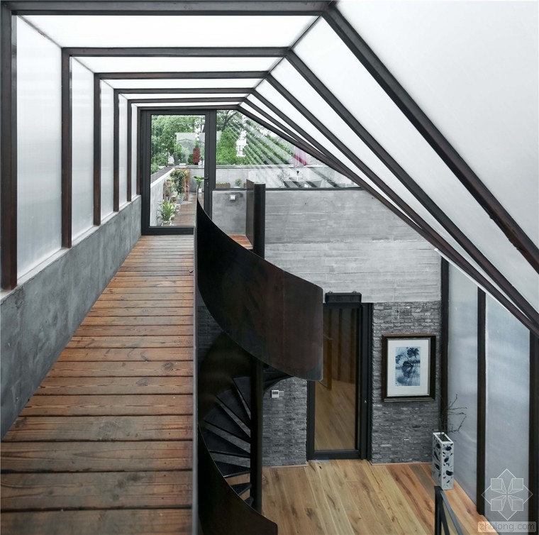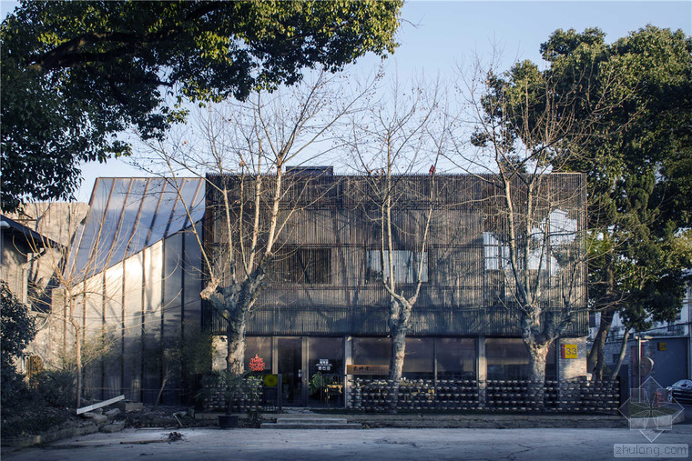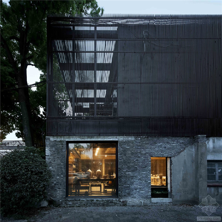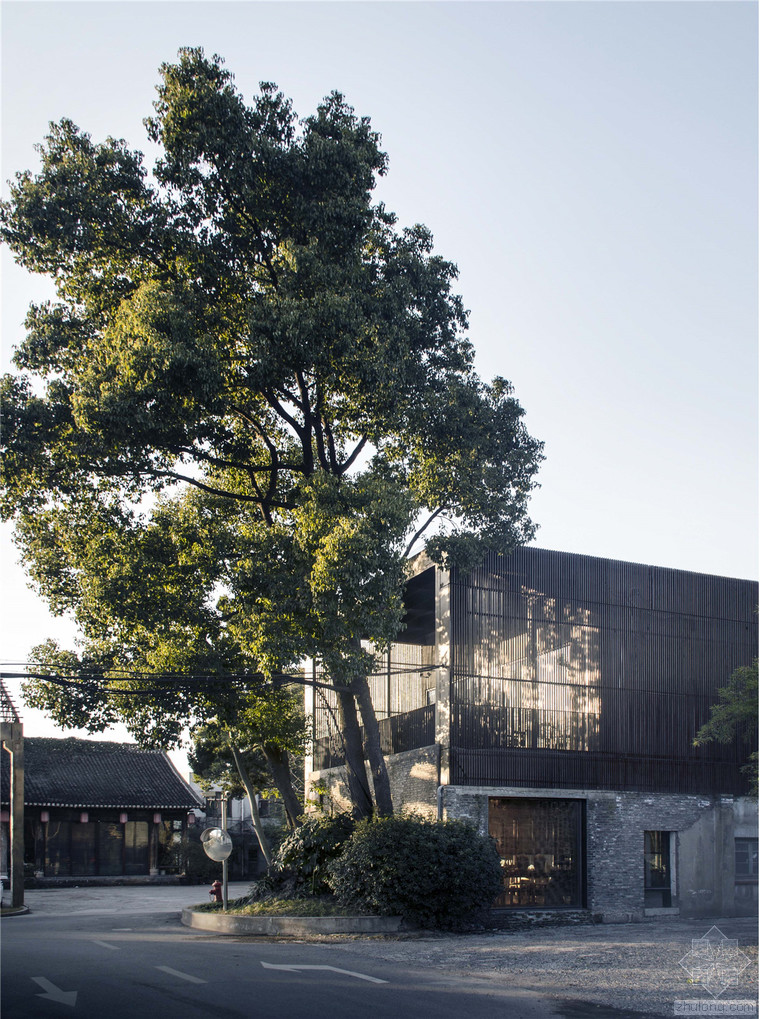 瓷語堂項(xiàng)目是對建筑原真性的一次回歸,我們希望通過一個(gè)最簡單的手段介入場地,使得建筑物僅僅作為一個(gè)“存在”與基地發(fā)生關(guān)系,而不是通過美學(xué)加以評判。在面對場地現(xiàn)狀已經(jīng)存在的幾棟老建筑和一棵大樹,我們希望它們可以成為場地記憶的再現(xiàn),作為新建筑的一部分共同留存下去,而不是簡單的粗暴拆除并由一個(gè)全新的物體所替代。通過合理的結(jié)構(gòu)布置和構(gòu)造處理,新房子輕巧的微微落于老墻之上,二者完整的融合在了一起,斑駁的老墻和由磚、木等樸素材料構(gòu)筑的新建筑自然而然的和諧共生,而老墻的歲月留下的痕跡亦為建筑提供了不可復(fù)制的特征。場地上的大樹成為了我們南側(cè)的重要遮蔽,使得二層的露臺不會(huì)直接暴露在正對的一條小路前面,同時(shí)也為露臺貢獻(xiàn)了不同季節(jié)的多樣風(fēng)景和光影特質(zhì)。作為陶瓷藝術(shù)家展示、交流和工作的場所,空間的布置簡潔而不失特點(diǎn),混凝土、青磚等樸素而帶有一點(diǎn)點(diǎn)粗糙質(zhì)感的材料與陶瓷藝術(shù)品相映成趣,建筑低調(diào)地成為了作品的背景。