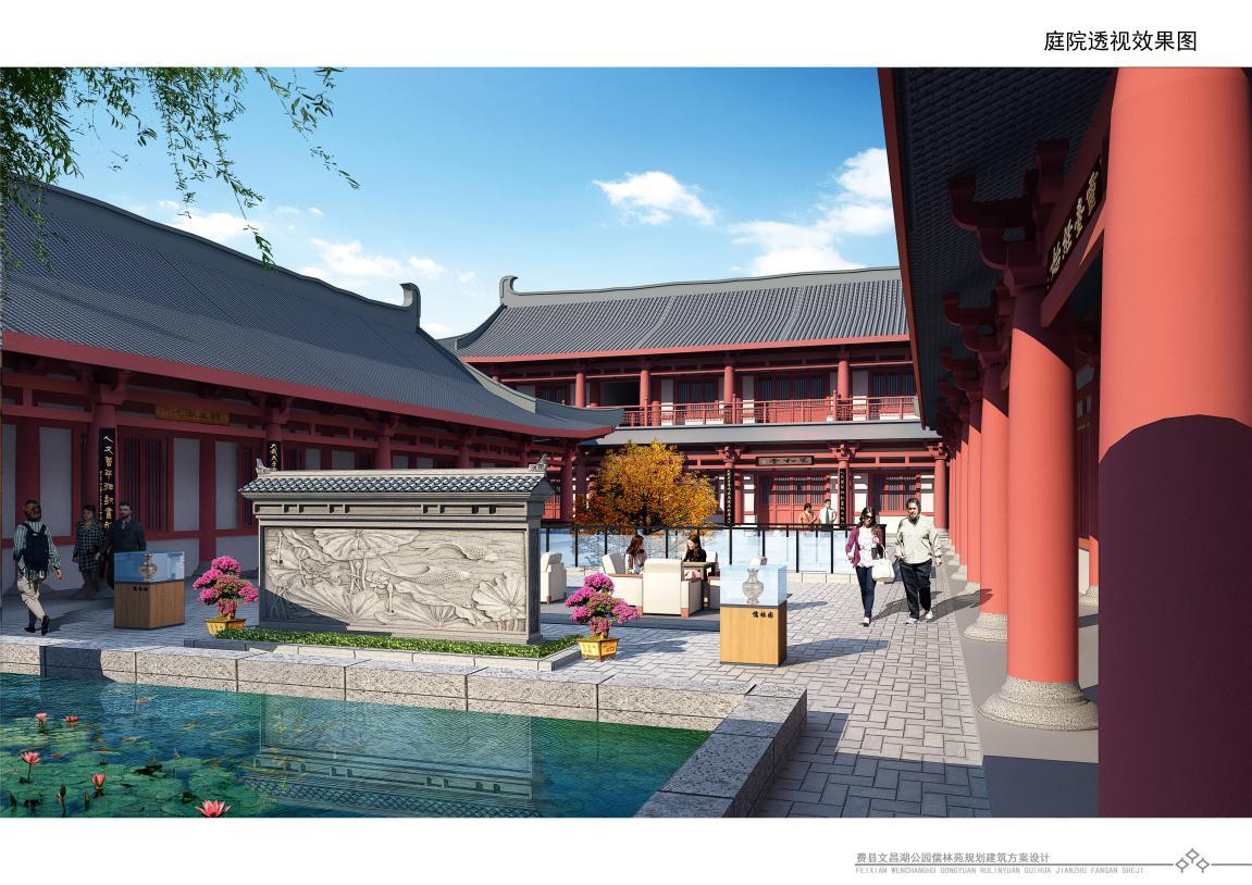 文昌湖公園位于費縣自由路上,地處河邊。而儒林苑則是在文昌湖公園里修建的一處休息用的庭院。該處庭院在設計初期選擇了多種建筑樣式,最后定格在四合院的建筑風格上。